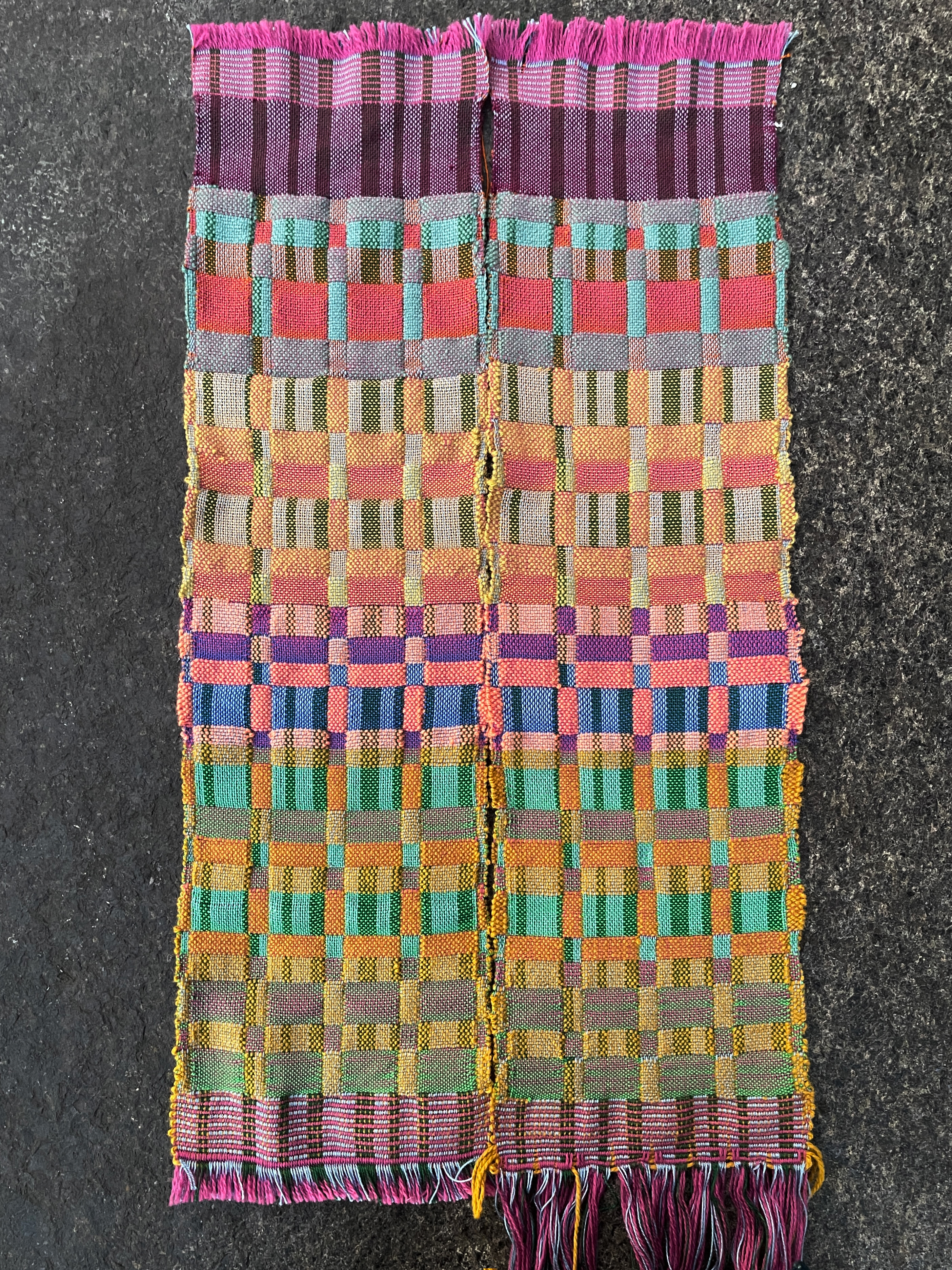 This dress was inspired by my mother and incorporated a crochet piece that she made. It has the Chinese characters of “Liberty”, and can be inserted into the slits of the dress. The body of the dress is made of handwoven fabrics on an 8-harness loom and cochineal-dyed cotton fabrics.