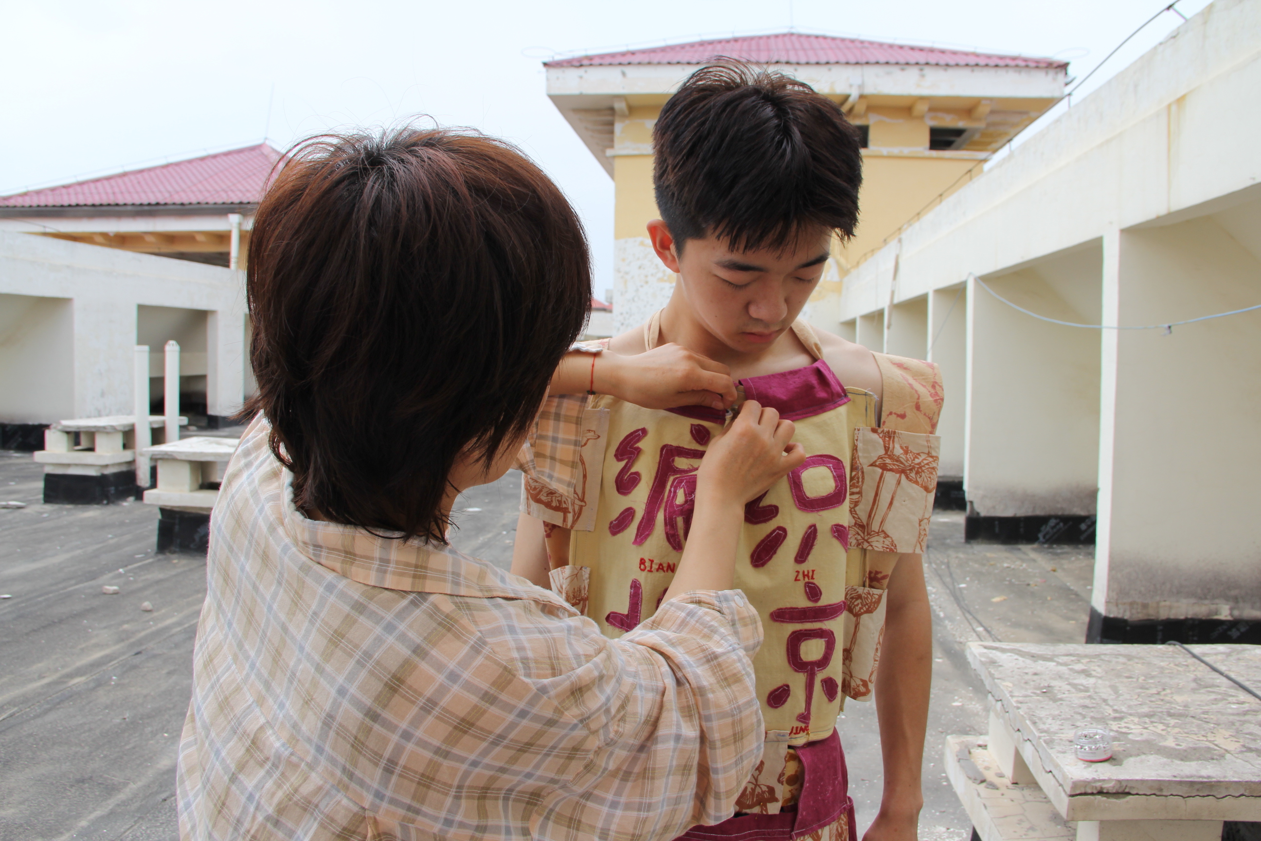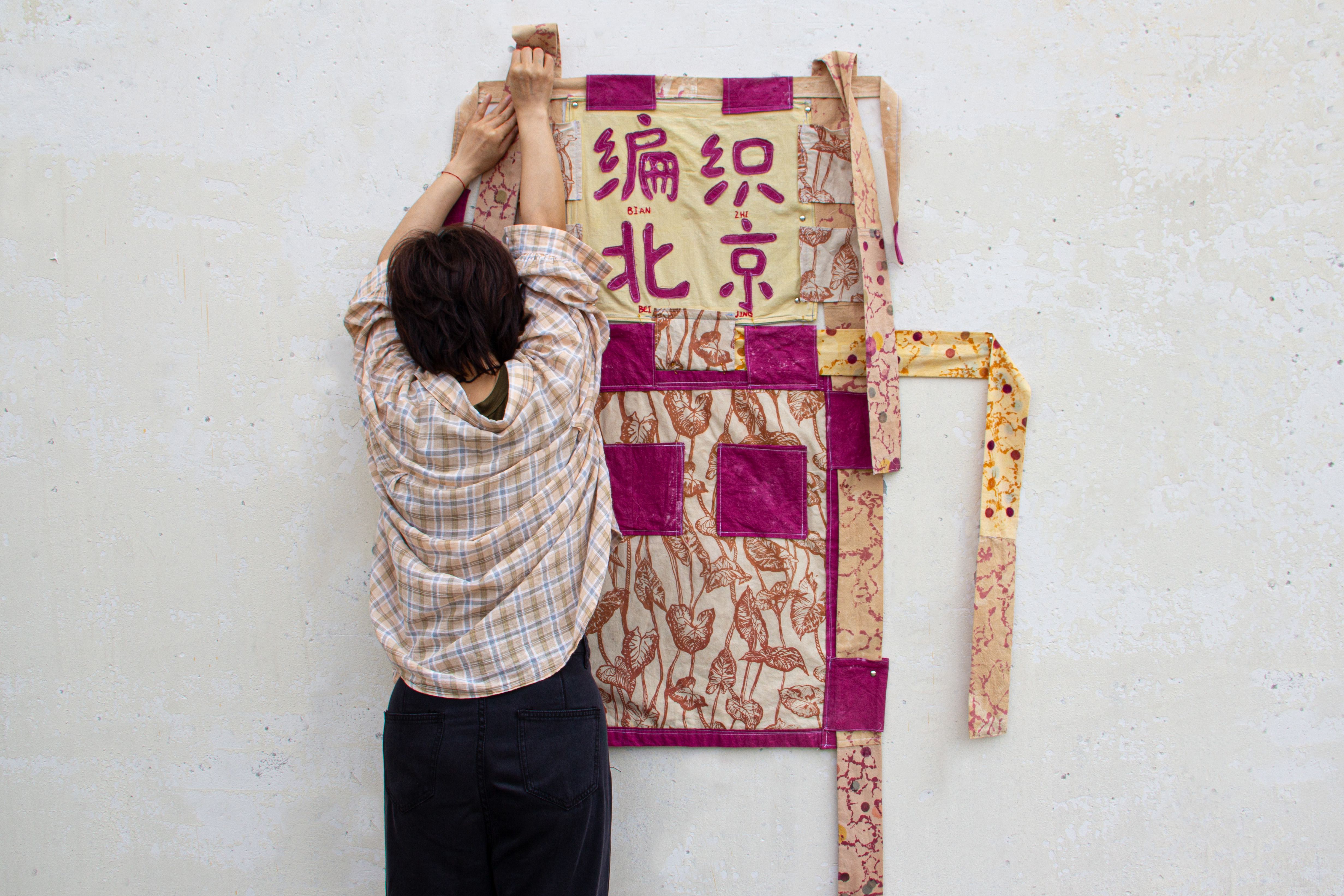 Naturally dyed and hand printed fabrics made into an apron. The Chinese characters translate to “Weaving Beijing”. Made for an imaginary weaving collective, where we publicly weave on the streets of Beijing.